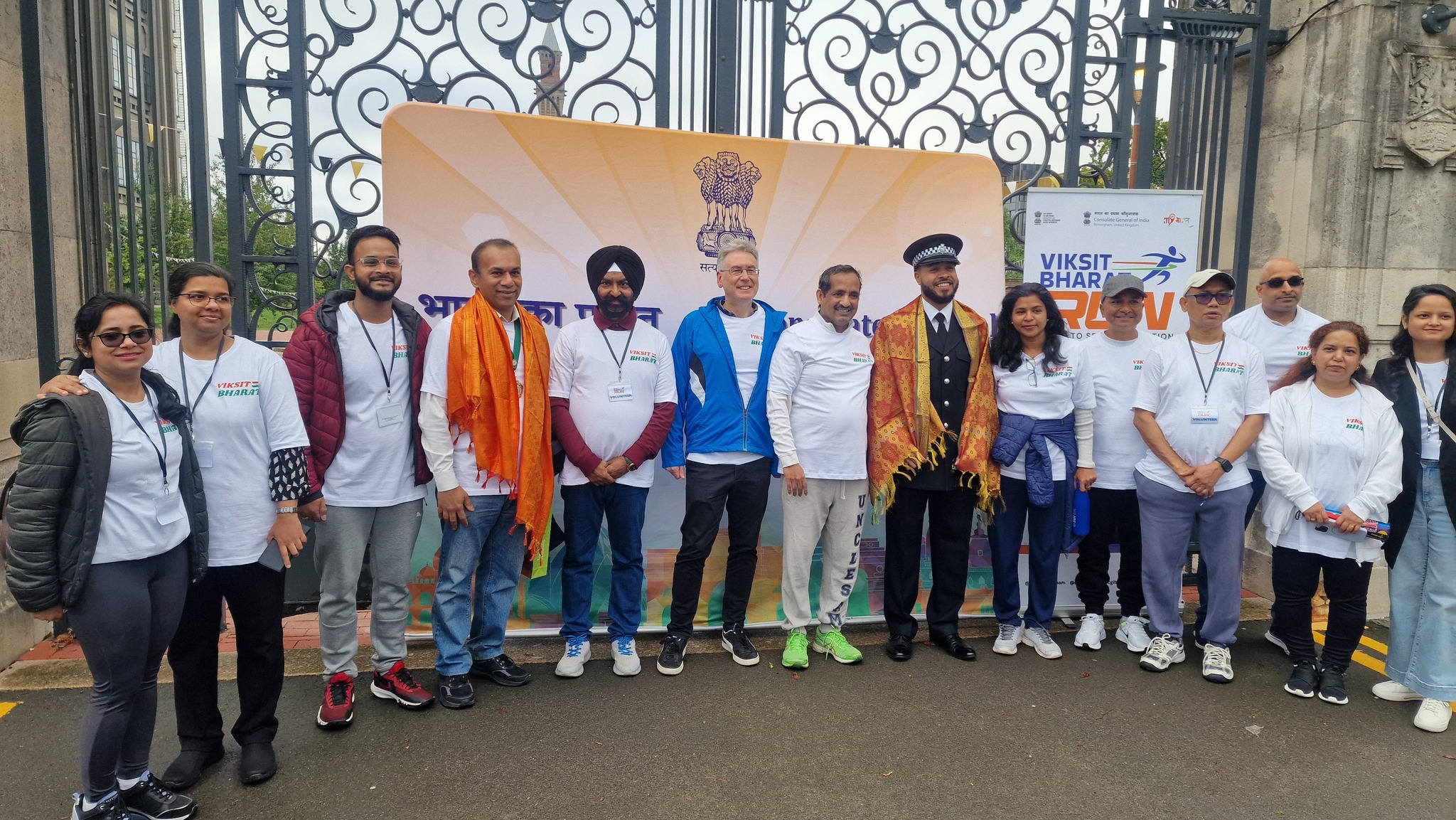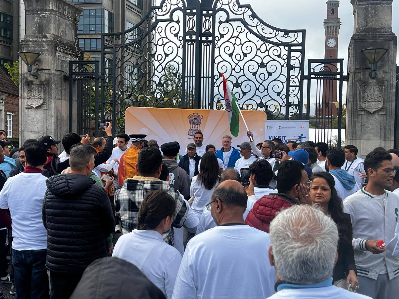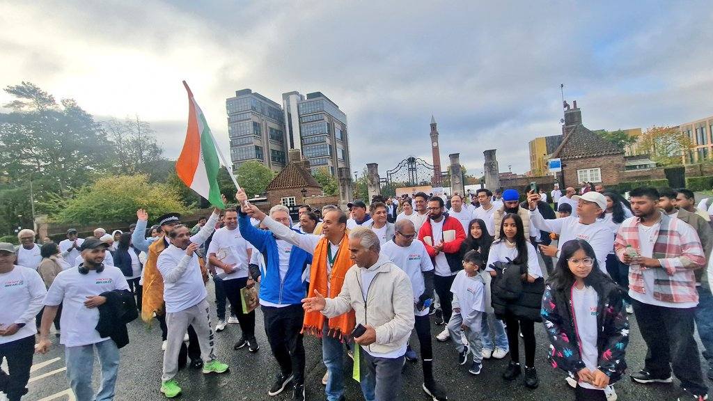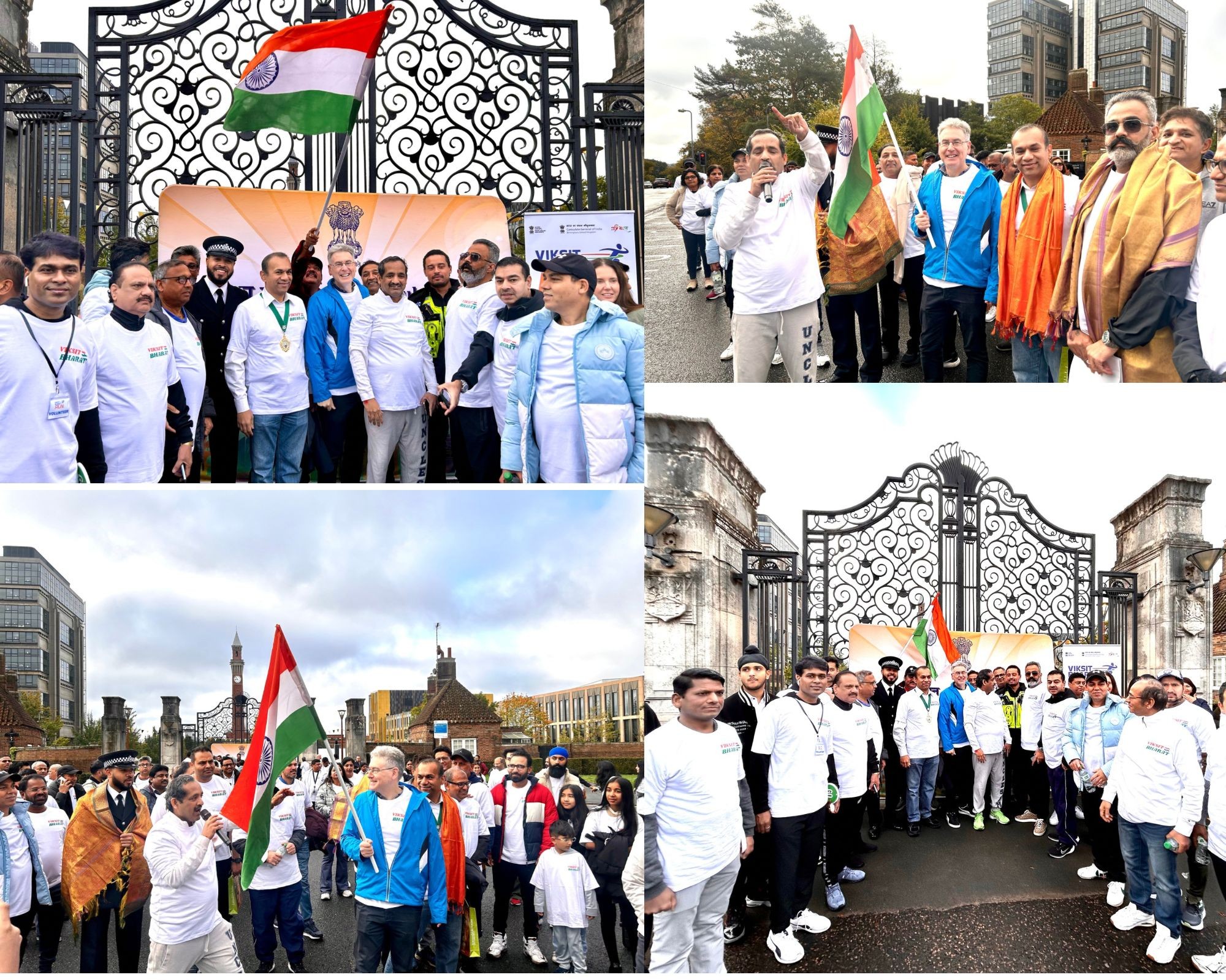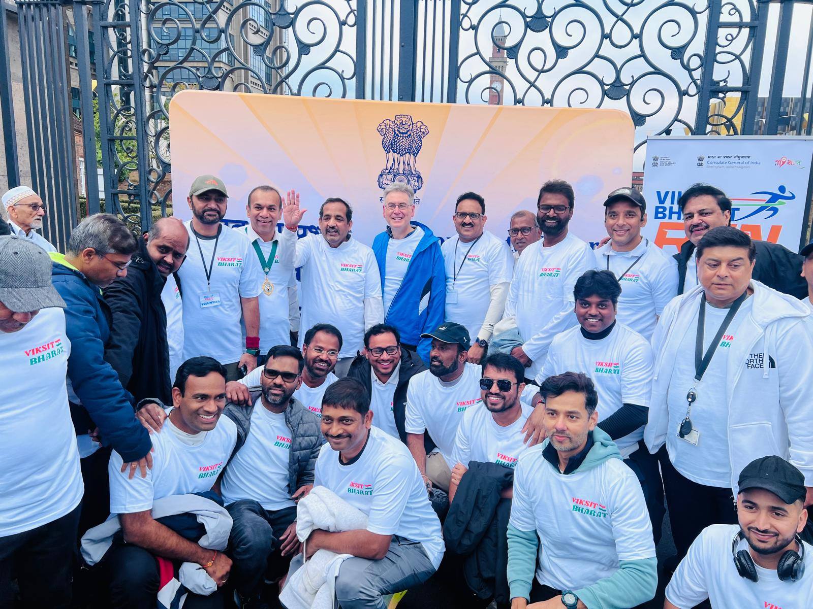Over 250 enthusiastic participants from the Midlands gathered at the iconic Old Joe University of Birmingham for the #ViksitBharatRun, a 2.5-mile journey from the iconic Old Joe, University of Birmingham to Broad Street’s Golden Boys statue, celebrating India’s vision of becoming a developed nation by 2047 and the deepening India–UK partnership. The scenic Canal Walk became a powerful symbol of India’s inspiring journey of progress and innovation, uniting the diaspora and wider community in the shared spirit of a Viksit Bharat . Consul General Dr Venkatachalam Murugan led the celebrations and highlighted the rise of India on the world stage. It signifies the Amrit Kaal, the Era of Elixir – Hon’ble PM Sri Narendra Modi’s vision for New India in the next 25 years. It aims at restructure as fragments of Indian economy, through rapid growth, better living conditions for all. Infrastructure, technological advancements and reawakening World’s trust in India. During this special fortnight, ministries, government bodies and communities across India and abroad come together to serve society, strengthen bonds and promote shared responsibility. A key highlight this year is the Viksit Bharat Run, organised across 125 global locations with the theme “Run to Serve the Nation,” offering an opportunity to showcase India’s achievements, promote unity and amplify global partnerships while creating spaces for youth engagement, leadership development and diaspora participation. Leaders and community representatives—including Simon Foster (Police & Crime Commissioner), Prof Mark Lee (DPVC–India, University of Birmingham), Prof Kiran Patel (Chief Medical Officer, University Hospitals Birmingham), Inspector Ellis Turner (Neighbourhood Policing), Ravi Katamaneni (Doctors’ Association), Sailender Kundal (Uttarakhand community), Mr Parvesh Shukla (NRI Head, Rejoice Health Foundation International & Convern Sky Foundation), Dharm Dutt (Geeta Bhawan) and Mohameed Kareen (Dawoodi Bohra Community)—joined to celebrate the spirit of Seva and Atmanirbhar Bharat, taking pride in India’s heritage and strengthening bonds with fellow Indians globally. As part of this global movement across 75+ cities worldwide, the Birmingham event showcased the rise of a New India, inspiring collective action and reinforcing the message: Run with purpose, celebrate the journey, and pledge for a Viksit Bharat and Atmanirbhar Bharat.