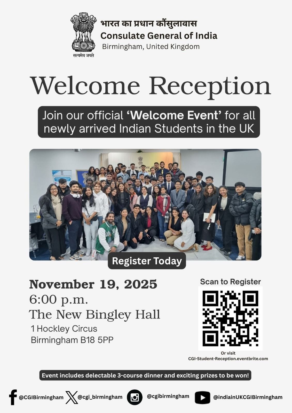 Indian students in the Midlands! You’re warmly invited to join us on 19th November at 6:00 PM at Bingley Hall, Birmingham, for an engaging evening of learning, networking, and celebration. The event will feature insightful information sharing, interactive discussions, and an opportunity to connect with fellow students and professionals — all followed by a delicious dinner. Don’t miss this wonderful evening of ideas, connections, and community. Seats are limited, so register now at