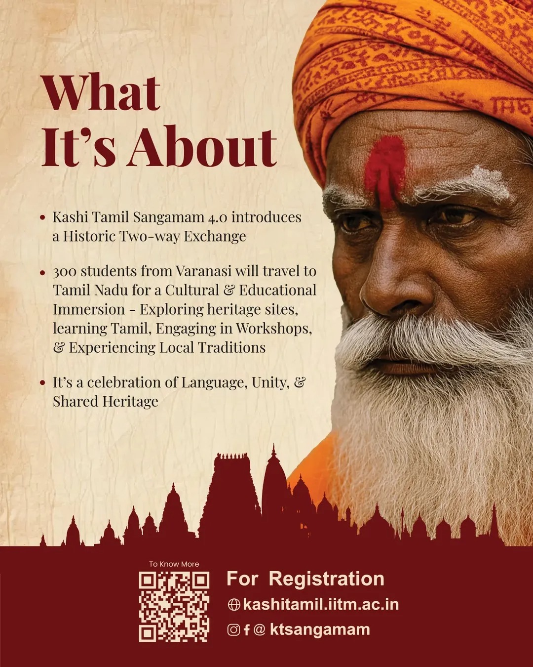 Building on the tremendous success of previous editions, KTS 4.0 offers participants immersive experiences across Varanasi, Prayagraj and Ayodhya ranging from seminars and heritage tours to cultural performances, exhibitions, local cuisines, and sporting events. KTS 4.0, with the theme “Let us Learn Tamil - Tamil Karkalam”, seeks to spread classical Tamil knowledge across India, including through the campaign “Karpom Tamil” teaching Tamil to students in Uttar Pradesh, further uniting the nation in its cultural richness. Join KTS 4.0 and be part of a remarkable journey that celebrates India’s unity, heritage, and cultural harmony. #kashitamilsangamam4_0 Registrations are now open: http://kashitamil.iitm.ac.in
