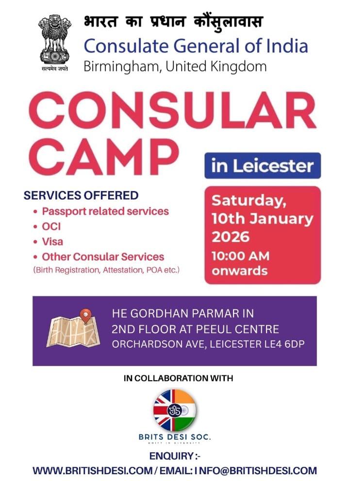 Consular Camp - Leicester, UK — The Consulate is pleased to announce “Consular Services at Your Doorstep”, a special walk-in consular service camp to be held in Leicester on 10 January, starting from 10:00 AM.